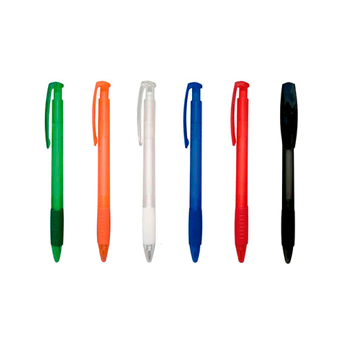 - Lapicero plástico retráctil de color traslúcido, con goma antideslizante en la base. Color de tinta azul.