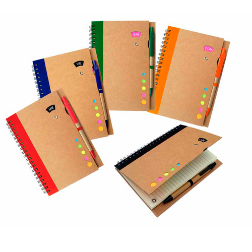 - Libreta ecológica que contiene: 1 lapicero ecológico, 5 post it pequeños de diferentes colores, ruleta giratoria en la tapa para señalar el día de la semana y 70 hojas ecológicas rayadas.