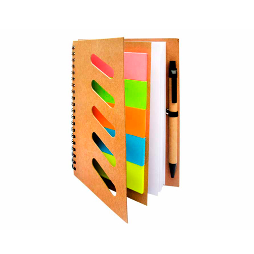 - Libreta ecológica que contiene 5 post it medianos de diferentes colores, 1 lapicero ecológico y 70 hojas blancas.