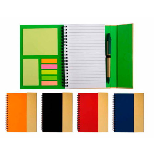 - Libreta anillada de aprox. 70 hojas blancas rayadas, 25 hojas de notas adhesivas y banderas, bolígrafo ecológico.