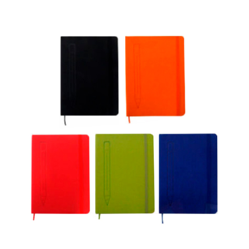 - Libreta cubierta de poliuretano de 80 hojas de papel crema con línea, banda elástica, marcador de cinta.