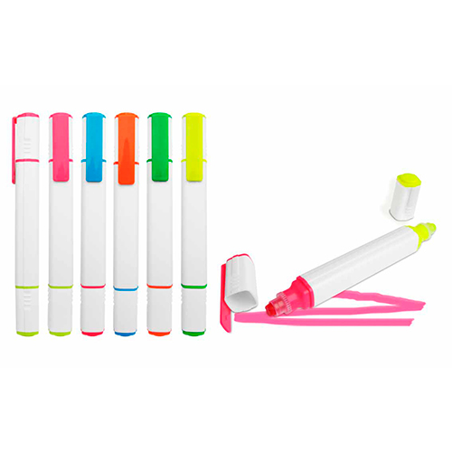 Resaltador en forma de lapicero con doble punta en 2 colores diferentes.
