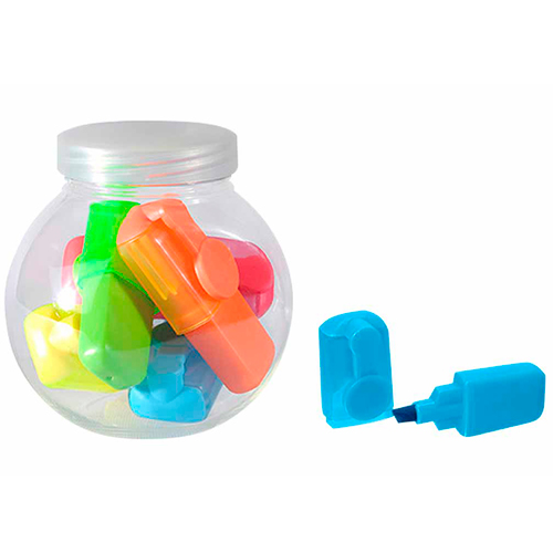 - Resaltadores en 5 colores: Fucsia, Naranja, Amarillo, Verde y Celeste. Dentro de un pote.