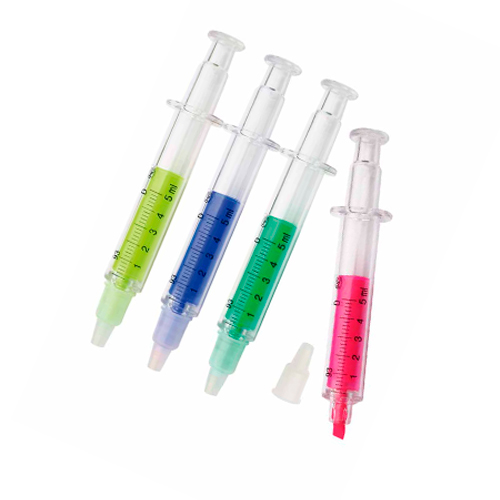 - Resaltador en forma de Jeringa, Material: Plástico.